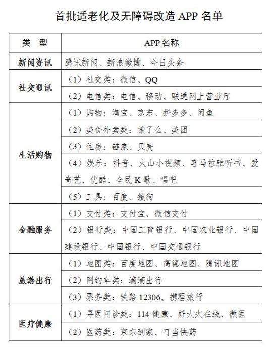 开展老年人、残疾人常用移动互联网应用(APP)的适老化及无障碍改造。立足老年人、残疾人的实际生活体验,丰富满足其需求的移动互联网应用(APP)种类和功能,对《工业和信息化部中国残疾人联合会关于推进信息无障碍的指导意见》(工信部联信管〔2020〕146号)中列出的移动互联网应用十大领域、注册用户数超过5000万人、同类产品中市场份额排名前5名的APP进行适老化及无障碍改造。首批优先推动新闻资讯、社交通讯、生活购物、金融服务、旅游出行、医疗健康等6大类、共43个APP进行适老化及无障碍改造(APP名单见附件2)。中国信息通信研究院协助各互联网企业,在开发设计移动互联网应用(APP)的过程中落实信息无障碍有关标准的要求,并将无障碍优化纳入产品及服务的日常维护流程。
