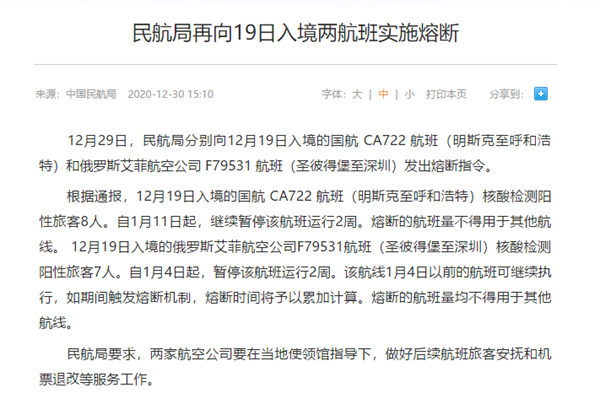 中国民航局30日发布消息,12月29日,民航局分别向12月19日入境的国航 CA722 航班(明斯克至呼和浩特)和俄罗斯艾菲航空公司 F79531 航班(圣彼得堡至深圳)发出熔断指令。