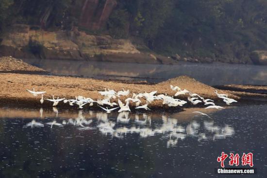 资料图:在湖北远安县花林寺镇桃李村,成群的白鹭在河滩上时而结伴高飞,时而漫步河滩,场景十分壮观。 王光华 摄