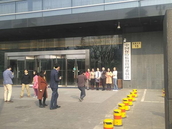 3月21日下午,更换门牌在即,保监会门口众多工作人员拍照留念。 杨峰 摄
