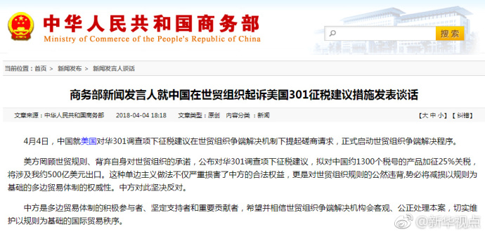 新华网北京4月4日电 商务部新闻发言人表示,美方这种单边主义做法不仅严重损害了中方的合法权益,更是对世贸组织规则的公然违背,势必将减损以规则为基础的多边贸易体制的权威性。中方对此坚决反对。 (据新华社“新华视点”微博报道)
