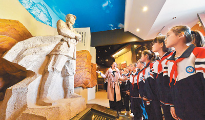图为4月4日,河北邯郸市邯山区明珠实验小学学生在晋冀鲁豫烈士陵园左权纪念馆学习先烈事迹。