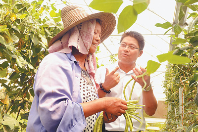 图为刘伟平(右)了解村里菜农种植情况。