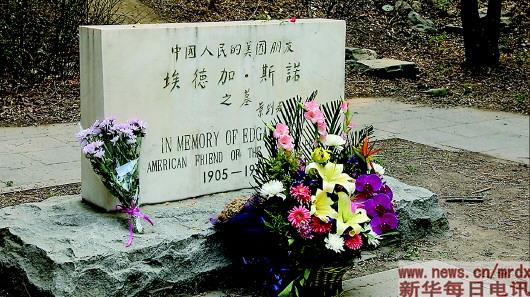 四月的北京大学未名湖畔,一片春意盎然。湖畔小路南侧的斯诺墓前,整齐摆放着几束鲜花,最外面的那束尤为新鲜。北京大学元培学院党委书记、中国埃德加·斯诺研究中心主任孙华说,这是中安宾馆的全体党员来给斯诺先生扫墓留下的,中安宾馆的原址是斯诺夫妇上世纪30年代在北京时的居住地。