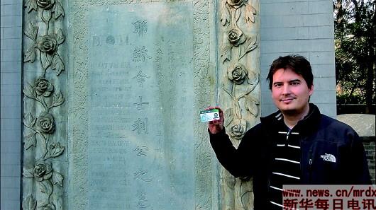 清华大学留学生西泰拿出带有自己名字的学生证与利玛窦墓碑合影。