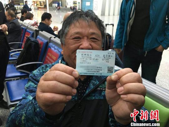 早早来到杭州东站的陈樟虎今年61岁,是地地道道的杭州人。今天陈樟虎显得格外兴奋,因为他幸运地购买到了首班杭州始发北京“复兴号”动车组G20次列车的第一张车票。