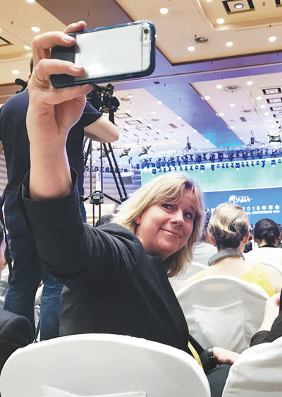一名外国记者在开幕式现场自拍留念。本报记者 杨 迅摄