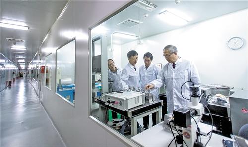 中国科学院院士罗俊教授(右)在华中科技大学引力实验中心与科研人员交流实验情况。新华社记者 熊琦摄