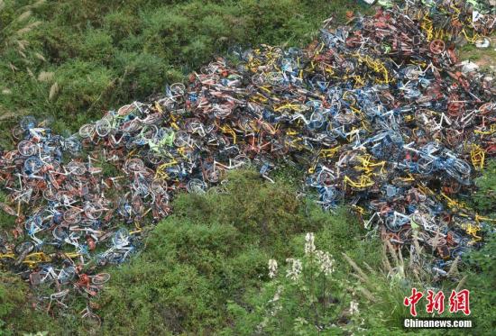 资料图:杂乱堆放着一片共享单车。 中新社记者 张斌 摄