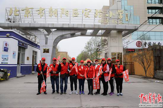 北京市朝阳区实验小学雄安校区,参加“家校警”护学队的当地家长志愿者在校门口。
