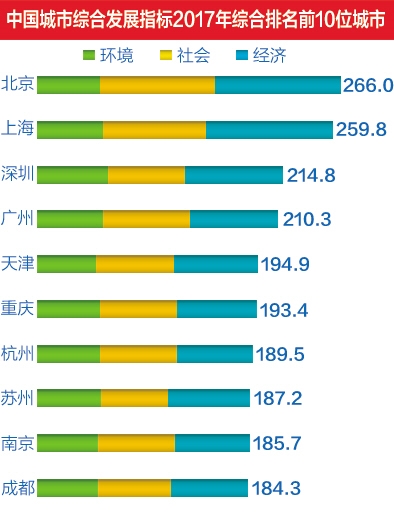 近日,国家发展和改革委员会发展规划司与云河都市研究院共同编制的《中国城市综合发展指标2017》报告正式公开发行。该指标显示,北京、上海、深圳分别蝉联综合排名的冠亚季军,广州、天津、重庆、杭州、苏州、南京、成都分别名列综合排名的第4位到第10位。该指标从环境、社会和经济3个维度对中国297个地级及以上城市进行了全方位和系统性的评价,利用庞大的数据直观地反映了中国城市的发展现状,探索中国下一步城市化进程和实现高质量发展的道路和方向。