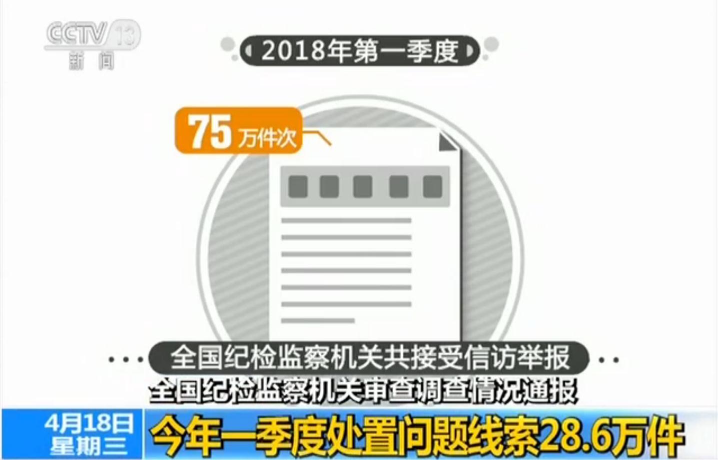 从通报内容来看,2018年第一季度,全国纪检监察机关共接受信访举报75万件次,处置问题线索28.6万件,谈话函询5.9万件次,立案11.9万件,处分9.6万人(其中党纪处分8万人)。