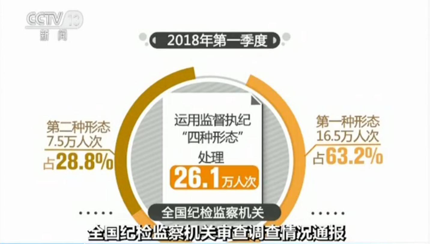 此外,2018年第一季度,全国纪检监察机关运用监督执纪“四种形态”处理26.1万人次。 其中,第一种形态16.5万人次,占“四种形态”处理总人次的63.2%;第二种形态7.5万人次,占28.8%;第三种形态1.3万人次,占5%;第四种形态7800余人次,占3%。
