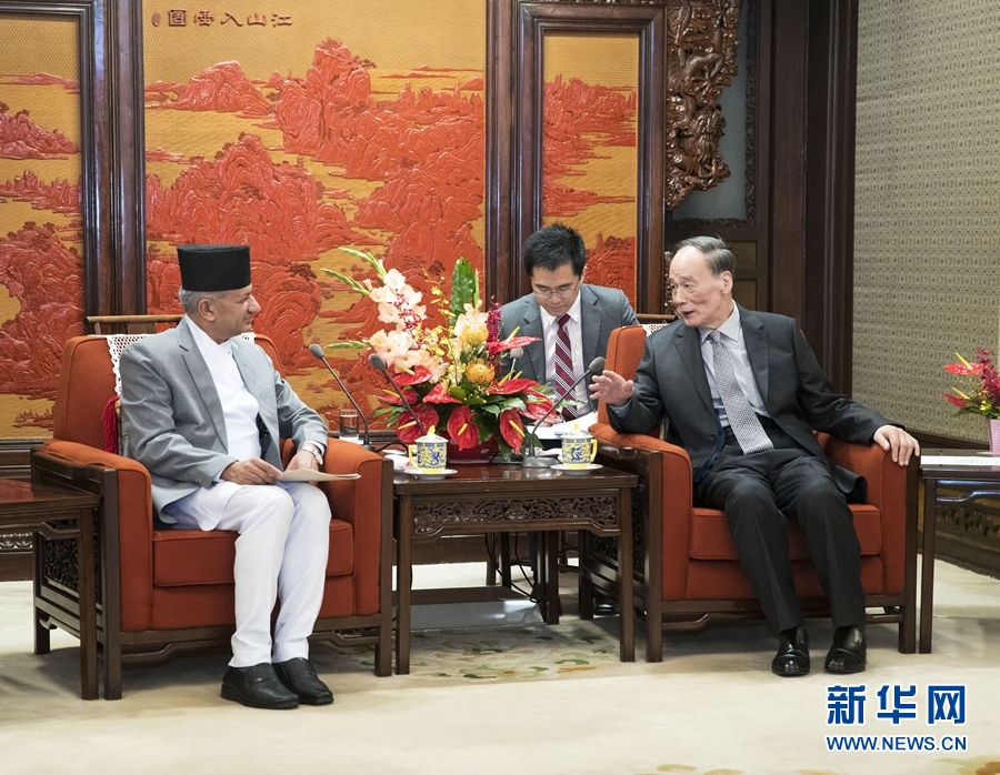 王岐山表示,中尼交往源远流长,是经过历史检验的好邻居、好朋友。在两国领导人共同引领下,中尼关系持续健康发展,各领域合作稳步推进。中国改革开放和社会主义现代化建设中,一条很重要的经验是处理好稳定与发展的关系,稳定是发展的前提,发展是稳定的基础。中方高兴看到尼泊尔完成政治转型,将国家建设重心转移到发展经济上来,支持尼保持团结稳定,实现发展目标。希望双方共同落实好已有共识和协议,以“一带一路”建设为契机拓展全方位合作,推动两国关系发展到新高度。
