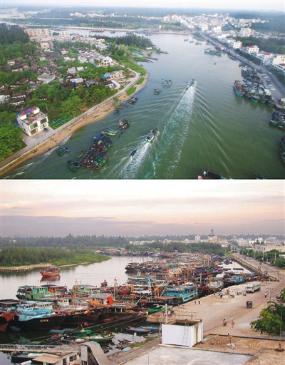 改革开放让海南这一昔日的边陲海岛跃升为美丽繁荣的国际旅游岛和活力迸发的经济特区,仅从岛东琼海市的今昔对比即可感受到海南建省30年带来的巨大变化。上图为2017年的海南琼海潭门港。下图为1996年的潭门港。
