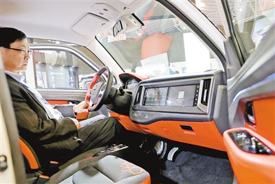 图为4月19日,一名参观者体验一辆装备有互联网+人工智能技术的电动汽车。