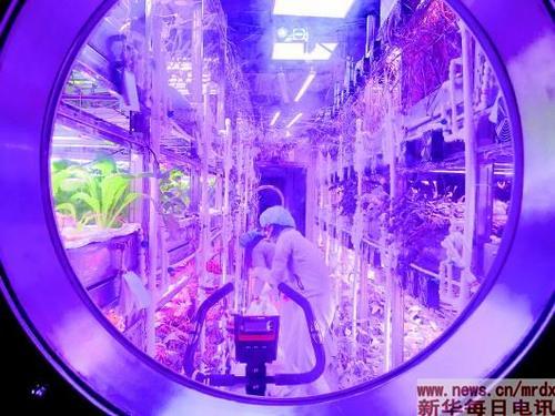 照片中紫红色的光是根据植物生长状况调节而成的人造光源,控制了植物的生长速率,也就保证了实验舱内氧气的含量。