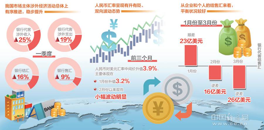 从外汇局公布的数据看,一季度,市场主体的涉外收入、支出以及结汇、售汇都呈现平稳增长。银行代客涉外收入同比增长25%,涉外支出增长19%,银行结汇增长16%,售汇增长9%,说明我国市场主体涉外经济活动总体上有序推进,且稳步提升。