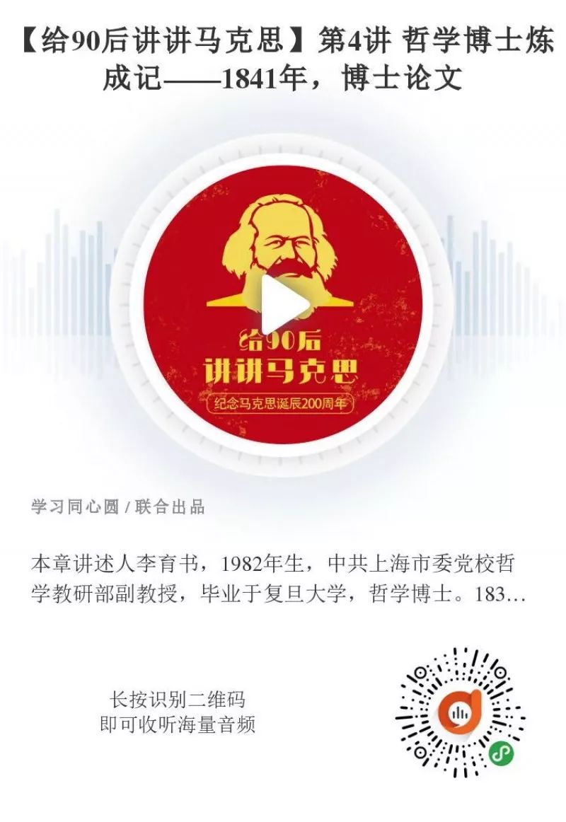 因此,马克思选择获取耶拿大学的博士学位。从结果来看,基本如马克思所愿,博士论文于1841年3月底完稿,4月6日马克思把它寄给耶拿大学哲学系,4月15日在马克思本人未到场的情况下,这篇论文全票通过,答辩组专家决定授予马克思耶拿大学哲学博士学位。但是,马克思拿到博士学位以后,有没有顺利进入大学任教呢?这个问题我们留待后面一讲为大家揭开谜底。
