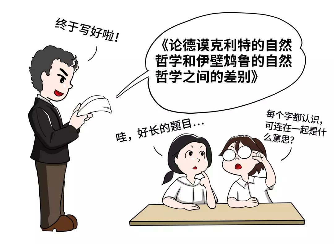 这个时候,马克思的导师鲍威尔前往波恩大学任教,他希望马克思尽快写完博士论文,拿到博士学位,这样就可以争取在波恩大学里谋得教师职位,一起做同事。于是在1840年下半年,马克思开始动笔写博士论文,他的博士论文题目非常绕口,叫做《论德谟克利特的自然哲学和伊壁鸩鲁的自然哲学之间的差别》。