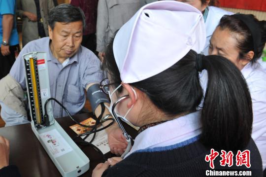 图为青海福利慈善医院大夫为老人测量血压。 央姬卓玛 摄