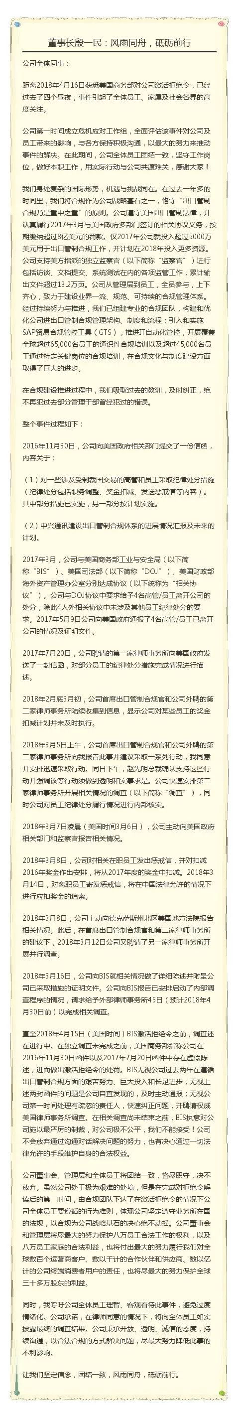 另据媒体报道,中兴通讯董事长殷一民发了封内部信,首次公布事件全过程。