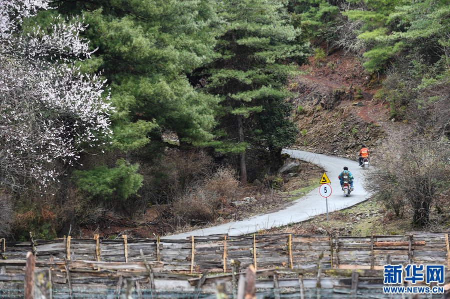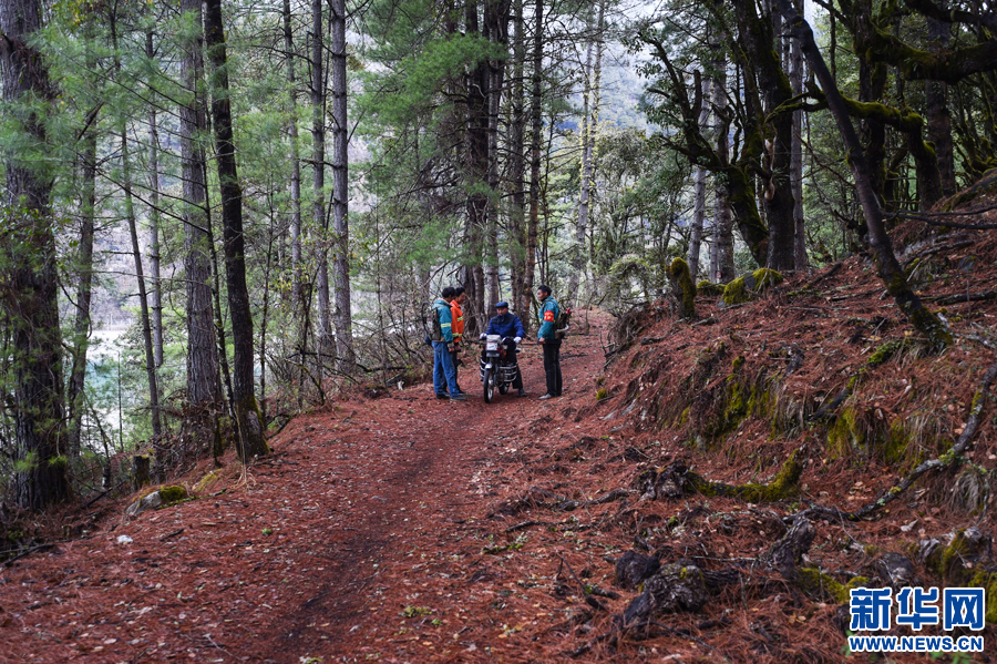 3月27日,护林员尼玛次仁、布迪和阿钦骑摩托车进入林区。新华网 达娃 摄