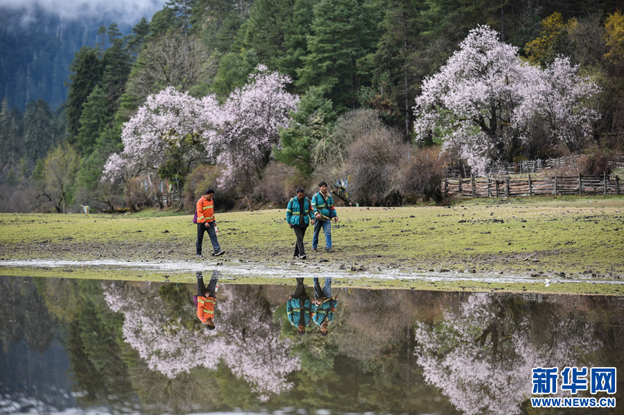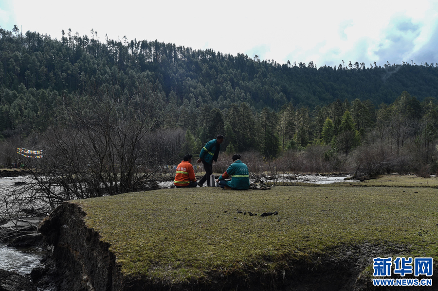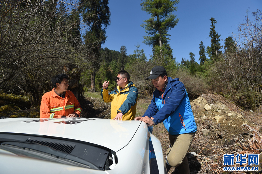 3月27日,护林员尼玛次仁、布迪和阿钦与过往人员了解情况。新华网 达娃 摄