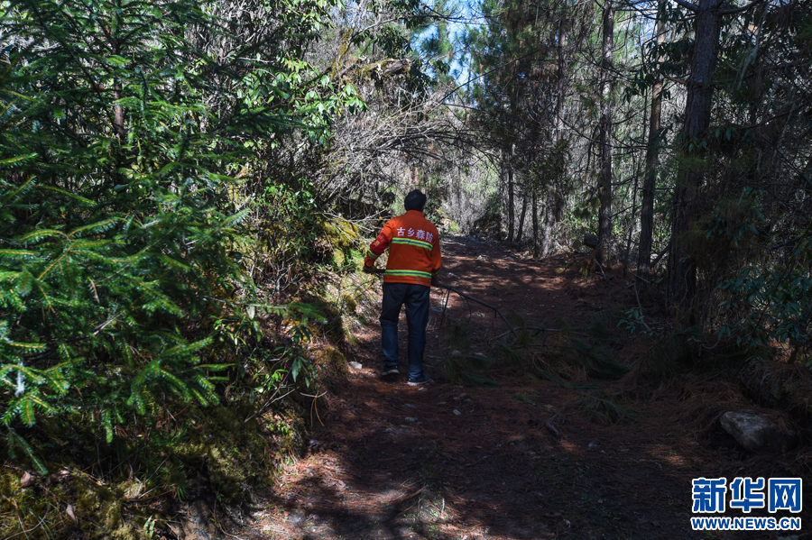 3月28日,护林员尼玛次仁在巡山途中清理枯枝。新华网 达娃 摄