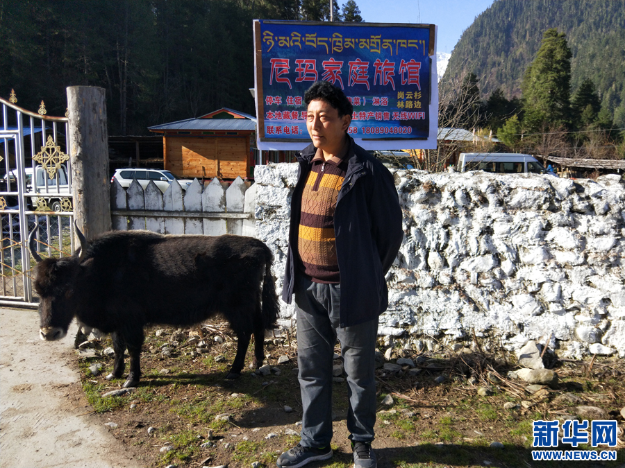 3月28日,护林员尼玛次仁在自家家庭旅馆门口。新华网 殷小燕 摄