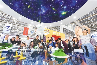 四月二十二日,观众在首届数字中国建设成果展览会上了解天地一体化信息网络工作示意模型。新华社记者 宋为伟摄