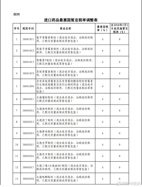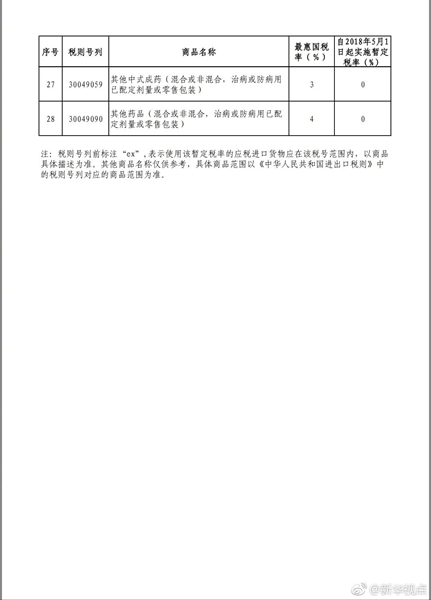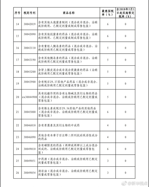新华网4月23日电 财政部关税司23日发布消息,5月1日起我国将取消包括抗癌药在内的28项药品进口关税。调整后,除安宫牛黄丸等我国特产药品、部分生物碱类药品等少数品种外,绝大多数进口药品,特别是有实际进口的抗癌药均将实现零关税。(记者郁琼源) (据新华社“新华视点”微博报道)