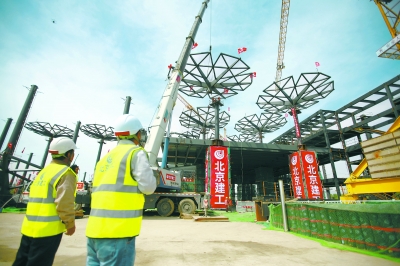 北京世园会国际馆18朵钢铁“花伞”上午吊装完成。