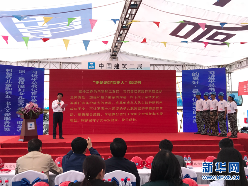 4月24日,全国留守儿童关爱保护“百场宣讲进工地”活动启动仪式现场,中建二局农民工代表上台宣读“我是法定监护人”倡议书。新华网 韩家慧 摄