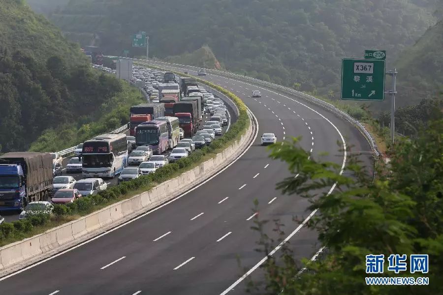 资料图:在广(州)乐(昌)高速公路广东清远段,自驾北上出游的车辆在高速公路上缓慢行驶。新华社发(李作描 摄)