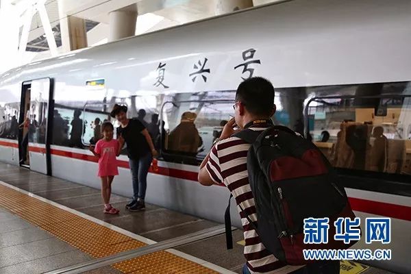 资料图:旅客与“复兴号”合影留念。新华网陈延特摄