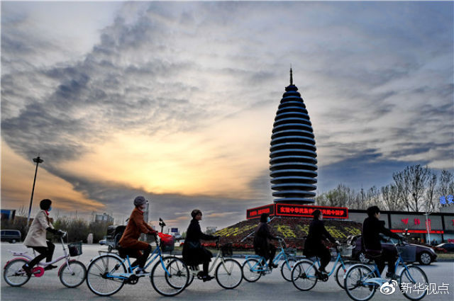 ↑市民在河北雄安新区容城县县城道路上骑行(3月29日摄)。新华社记者 牟宇 摄