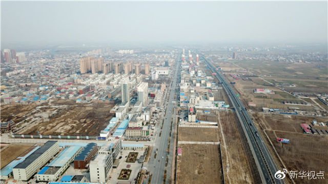 ↑这是河北雄安新区容城县县城(3月21日无人机拍摄)。新华社记者 杨世尧 摄