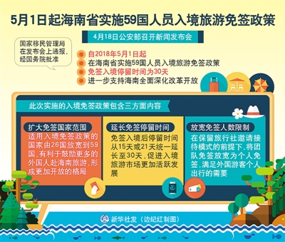 “扩大免签国范围;延长免签停留时间;放宽免签人数限制。”4月18日,公安部在京召开新闻发布会,国家移民管理局在发布会上通报:经国务院批准,自2018年5月1日起,在海南省实施59国人员入境旅游免签政策,进一步支持海南全面深化改革开放。