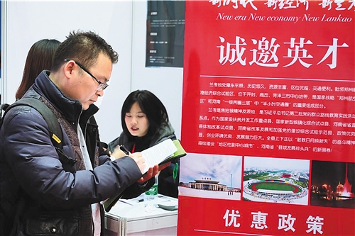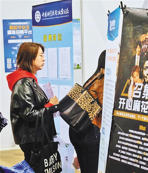 中国人民大学毕业生在第五届全国大中城市联合招聘高校毕业生(春季)巡回招聘会上,阅读企业宣传海报。