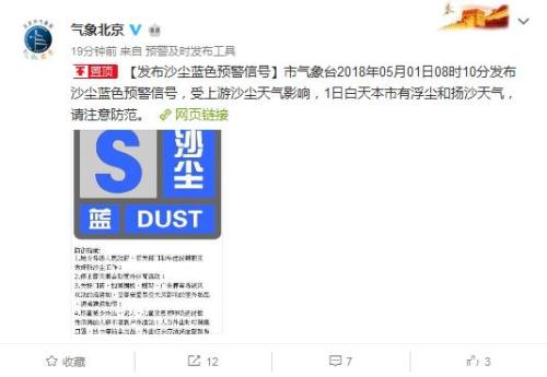 中新网5月1日电 据北京市气象局官方微博消息,北京市气象台2018年05月01日08时10分发布沙尘蓝色预警信号,受上游沙尘天气影响,1日白天北京市有浮尘和扬沙天气,请注意防范。