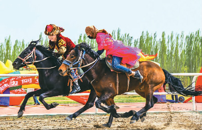 图为4月30日,赛马会上的民俗表演——姑娘追。