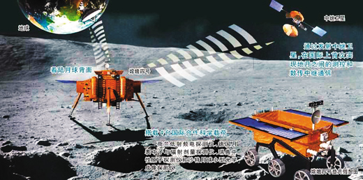 嫦娥四号登月探测器是嫦娥三号的备份星,计划将登陆月球背对地球一面的南极附近的艾特肯盆地。由于月球被地球潮汐锁定,它只能永远以同一面朝向地球。这就意味着,在月球背面登陆的嫦娥四号与地球上的测控中心不仅相隔遥远的地月距离,而且还要隔着月球球体进行通信联系。但通信信号无法穿透月球抵达其背面,这就需要中继卫星的帮助来实现数据传输,完成地面测控任务。这是“嫦娥”此次发射奔月之前先发射“鹊桥”卫星的原因。