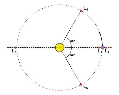 茫茫宇宙浩渺无垠,“鹊桥”发射升空后将架设在哪里才能充分发挥其提供中继服务的作用呢?这就必须提到一个概念:拉格朗日点。根据天体力学,一个小物体在两个大物体的引力作用下居于空间中的一点,在该点处,小物体相对于两个大物体基本保持静止。这些点的存在由瑞士数学家欧拉于1767年推算出前3个,法国数学家拉格朗日于1772年推导证明剩下的两个。1906年,首次发现运动于木星轨道上的小行星在木星和太阳的作用下处于拉格朗日点上。在每个由两大天体构成的系统中,按推论有5个拉格朗日点,但只有两个是稳定的,即小物体在该点处即使受外界引力的摄扰,仍然有保持在原来位置处的倾向。每个稳定点同两大物体所在的点构成一个等边三角形。