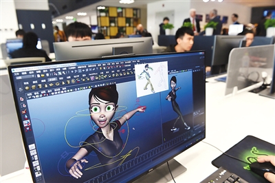 4月28日,来宾在青岛东方影都数字化工作室内参观影视后期制作。