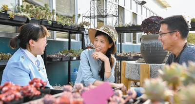 5月3日,山东龙口市基层党员(左一)来到东莱街道的花卉种植基地,耐心解答花农的问题,以期带动农民致富,实现乡村振兴,增强党建辐射带动作用。近年来,该市加强基层党建工作力度,创新开展丰富多彩的党建系列活动,充分发挥基层党员在带领村民脱贫攻坚、环境保护、发展经济、联户帮扶等方面的战斗堡垒作用。
