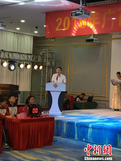 图为广西壮族自治区地震局副局长李伟琦在“2018年广西壮族自治区防震减灾知识竞赛”现场致辞。 杨陈 摄