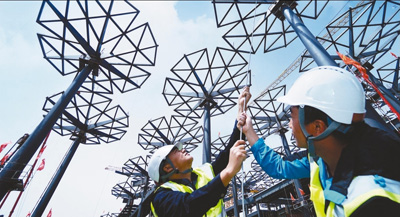 5月1日,工人正在北京世园会国际馆建设工地吊装“花伞”,竣工后国际馆将展现独特的“钢铁花海”景观。本报记者 贺 勇摄