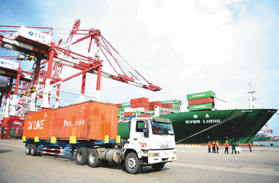 2018年4月13日,山东青岛港外贸集装箱码头,车辆在运送班轮装卸的集装箱。俞方平(人民视觉)