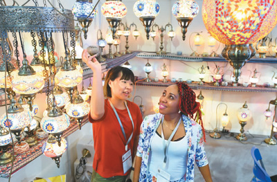 5月6日,2018中国义乌进口商品博览会开幕。图为参展商向外商介绍土耳其工艺灯。龚献明(人民视觉)